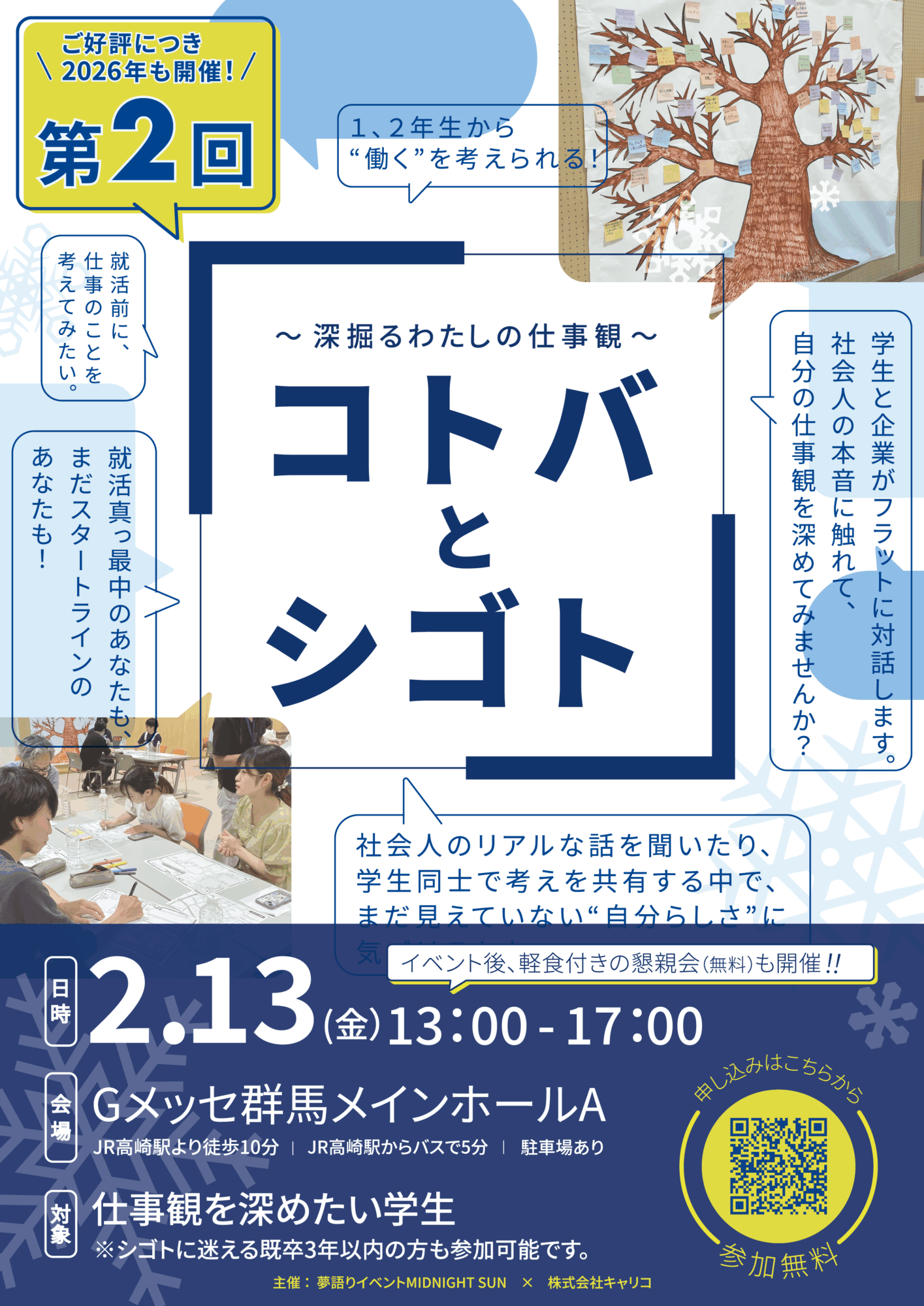 | イベント内容・その他 | <イベント概要> 「コトバとシゴト」は、 「どんな仕事に就くか」よりも、 「どんな価値観で働きたいか」を大切にする対話型キャリアイベントです。 いわゆる合同企業説明会や就職セミナーとは異なり、 学生と社会人がフラットな立場で対話しながら、 仕事観・価値観・働くことへの考え方を共有するイベントです。 「なぜその仕事を選んだのか」 「働くうえで、何を大切にしているのか」 肩書きや企業名といった情報にとらわれず、 “働く人の言葉”そのものに触れることで、 参加者自身が自分の価値観を見つめ直し、言葉にしていくことを目的としています。 <本イベントの特徴> 本イベントでは、 参加企業名をあえて【非公開】としています。 企業名やブランドによる先入観をなくし、 「どんな会社か」ではなく、 「どんな価値観を持った人が、どんな想いで働いているのか」 に向き合ってほしいと考えているためです。 先入観なく対話に臨めることで、偶然の会話や共感をきっかけに、 「自分に合う働き方」や「大切にしたい軸」に気づく出会いが生まれやすいことも、本イベントの特徴です。 <参加企業について> 当日は、群馬県内で売上100億円規模の企業をはじめとした大手・地域企業 計10社が参加予定です。 人事担当者や実際に現場で働く社員と直接対話することができます。 ▼参加企業を一部ご紹介 ✔️群馬の未来を走らせる、県内No.1カーディーラー! ✔️群馬に熱狂を生み出すプロバスケチーム ✔️世界の自動車の安全と住宅を群馬から!年商1,300億円のものづくり技術企業 <こんな方におすすめ> ・就職活動の前に、自分の価値観を整理したい大学1・2年生 ・就職活動本格化を前に、一度立ち止まって考えてみたい大学3年生 ・企業説明ではなく、働く人のリアルな話を聞いてみたい方 <プログラム内容> ◎対話セッション 参加者は複数のグループに分かれ、 企業の人事担当者や現場で働く社員と、テーマに沿った対話を行います。 企業名や肩書きではなく、 一人ひとりの「言葉」や「経験」を通して、 仕事観・価値観・働くことへの考え方を共有します。 対話を重ねる中で、 自分自身が大切にしたい価値観や働く軸を見つめ直し、 就職観の整理や自己理解を深めることを目的としています。 ◎フリートーク・交流会(立食形式) 対話セッション終了後には、 自由参加のフリートーク・交流会を開催します。 セッション中に話しきれなかったテーマについて深めたり、 気になった社会人や他の参加者と、 よりカジュアルに交流することができます。 イベントを通じた気づきや想いを言葉にし、 次の一歩につなげるための時間としてご活用ください。 |