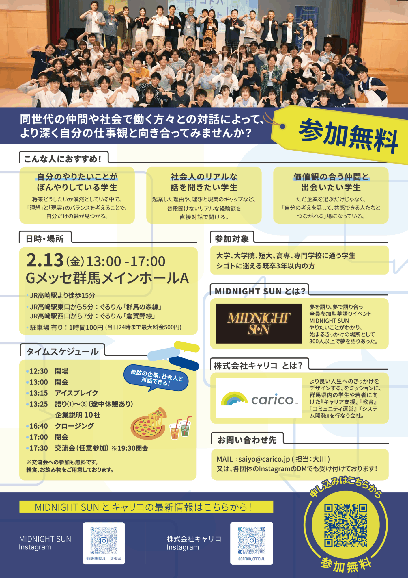 | 当イベントに関する お問い合わせ | 株式会社キャリコ 大川 TEL:080-9347-1120 Mail: gunma-career@carico.jp |
